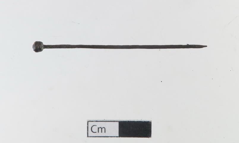 Smáprjónn (títuprjónn) úr messing, gamall, jarðfundinn á Skriðu í Fljótsdal: l. 5,5 sm.: hnöttóttur haus úr vírvafningi, þverm. 3,5 mm.