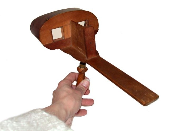 Þetta er hefðbundinn stereóskópmyndakíkir með renndu handfangi að neðanverðu