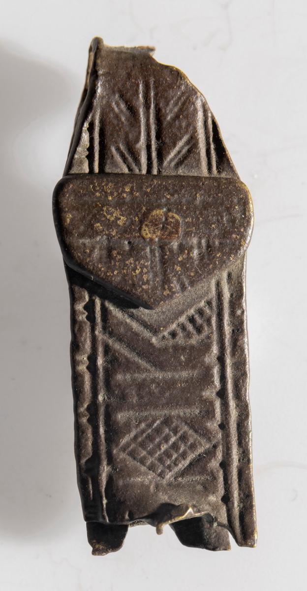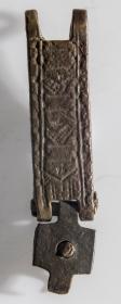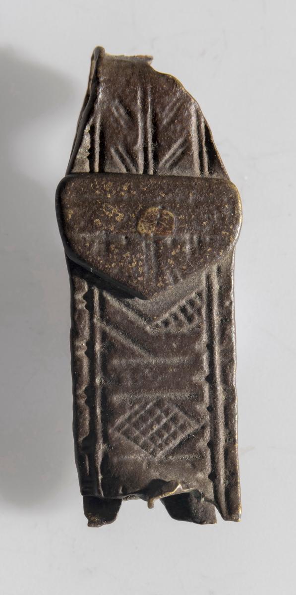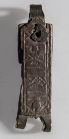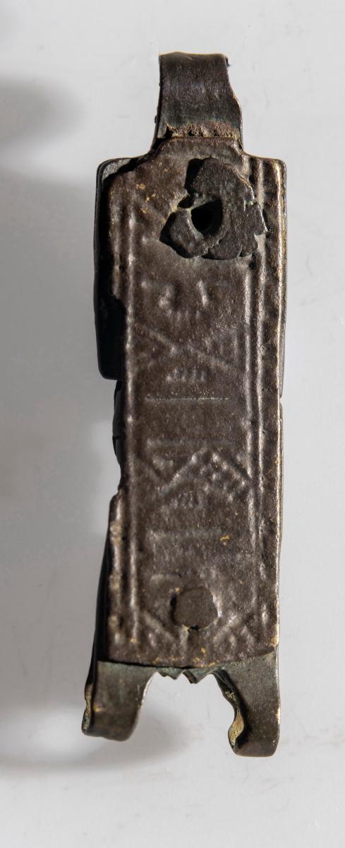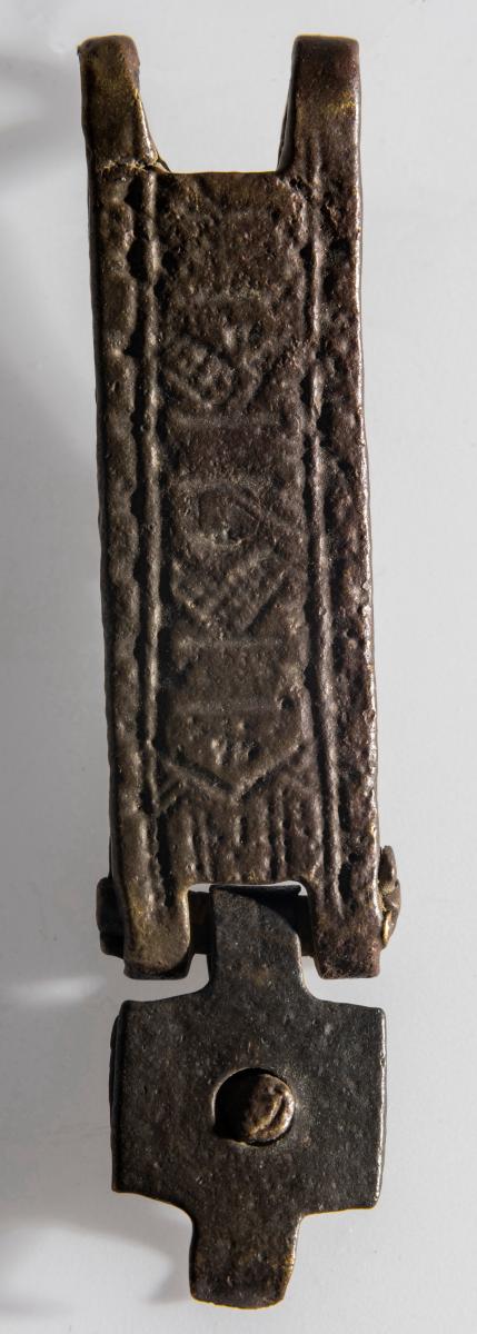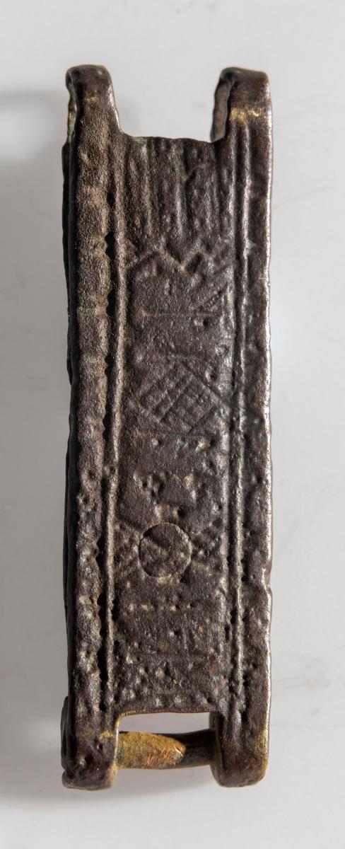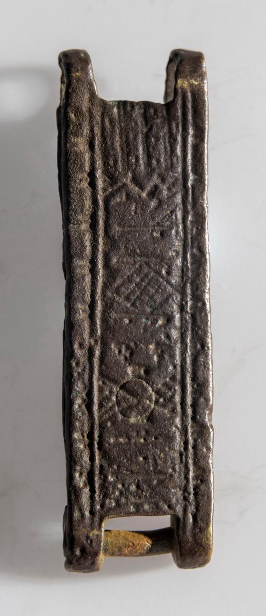 María. Mjór bekkur er með langbrúnum að ofanverðu og að neðan. Platan á milli er þreföld koparþynna, aðalhluti er ferstrendur, lykkjan á hvorn veg, í miðju gat og situr þar naglstúfur. Hæð hennar er 1.3 sm, br. 2 sm, þ. um 0.4 sm.