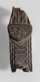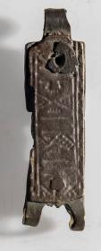 d. Brot af beltisstokk, annar endinn, og er á ein lykkja við miðjan enda. Þar sem ekki er brotið af. Lengd um 3.9 sm, br. mest 1.5 sm, þ. öll 1.5 sm. Tvær látúnsþynnur og plötuáfella úr látúni ofan á. Hér eru á framhlið tveir stafir sams konar áletrunar og er á ofantöldum stokkum, mjór bekkur gerður ofan við línuna og fyrir neðan. Skraut er við enda leturlínanna á stokkum þessum. Bakhlið er óskreytt. Þeir eru rauðleitir nokkuð og dökkir, orðnir mjög máðir og eyddir. Á tengiplötunni er dökkgrænn litur.