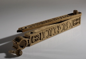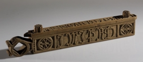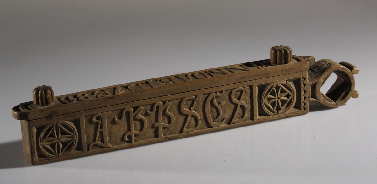 Prjónastokkur, holaður út úr einhverjum áferðarfallegum laufvið, 41 cm að lengd með handfangi, sem er á öðrum endanum, 3,6 cm á þykkt og 6,6 cm á hæð með loki. Ferkantað gat er skorið í gegnum handfangið, en að utan er það ávalt. Til beggja enda á báðum hliðum eru útskornar kringlur, en annars eru á hliðunum stórir, upphleyptir stafir: I M J Þ R D og A Þ P S E S, sem líklega eru upphafsstafir orða, sem á að lesa í samhengi. í miðjunni mun þó vera orðin: Þórunn Rustikusdóttir á þennan prjónastokk. Óvíst er hvað J M J merkir ( seinna J merkir líklega Jómfrú, en S E S er líklega fangamark karlmanns. Ofan á lokinu er skorið með upphleyptum stöfum: ANNO ARID 1880. Lokið er að aftanverðu fest með tappa með útskornum haus og að framan með sams konar tappa, sem læsir stokknum eins konar fábreyttri tappalæsingu. Frá sömu.