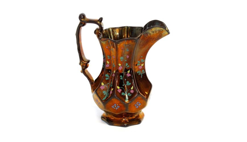 og grænum litum. Kannan er með haldi og er nokkuð flúruð, nokkurn veginn
