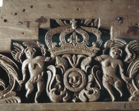 Skápur úr furu, 92 x 73,5 að st., þ. 28 cm. Framhlið og bak negld á með trjenöglum, en annars er hann geirnegldur. Hliðarnar eru strikheflaðar fremst og aptast. Framhliðin stendur nokkuð uppaf og niðuraf, og lárjettu fjalirnar að ofan og neðan nokkuð útfyrir. Í þá að ofan eru söguð skörð og stallar efst til prýðis. Framan á allar fjalirnar yzt eru negldir strikheflaðir listar, en eru nú allir af, nema sá sem er á lóðrjettu fjölinni hægra megin. Skápurinn hefur verið með 39,5 x 55 cm. stórri hurð, sem vantar gjörsamlega. Innan listanna eru framhliðarfjalirnar allar útskornar með samanhangandi blómskrauti: er útskurðurinn mjög djúpur, ber útlendan svip, helst í régence-stíl, er að því og öðru leyti líkur og á kistlunum nr. 2757 og 7292, sýnilega eptir sama mann. Blómskrautið gengur upp frá keri neðst og situr fugl á því: það er svo sem fest við undirgrind eða lista í bugum og brotum. Í hvoru horni efst er engill. Á miðju eru 2 englar, sem halda uppi kórónu yfir lítilli andlitsmynd í umgjörð með blómskrauti um. Andlitsmyndin og englamyndirnar allar eru ekki gerðar af neinni list. Blómskrautið er áferðarfallegra. Tvær heilar hillur eru í skápnum og hefur verið skotald neðaní hvorri þeirra: efst er 3. hillan, aptast og mjó, með skörðum í röndina til þess að festa í skeiðum. Miðfjölina í bakið vantar, og að ýmsu leyti er skápurinn skemdur af fúa og músáti. Er nú kominn frá Ketilsstöðum á Völlum, en óvíst er um fyrri eigendur hans. Frá síðari hluta, líklega síðasta fjórðungi 18. aldarinnar. Mun vera eptir Hallgrím bíldhöggvara Jónsson. Bekkurinn nr. 3613 er óefað eptir sama.
