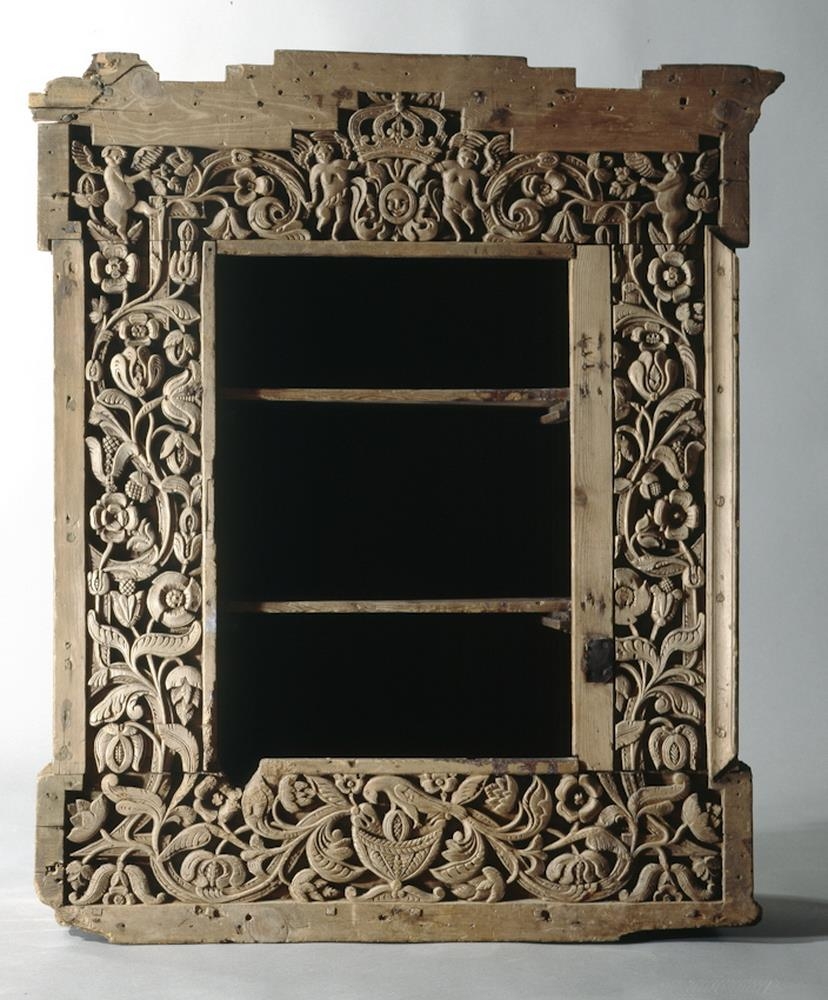 Skápur þessi er skorinn af Hallgrími Jónssyni, sem gjarnan var kallaður bíldhöggvari og oft kenndur við Kjarna í Eyjafirði. Hann var þekktur fyrir málaðar altaristöflur en þykir hafa tekist betur upp við útskurð.