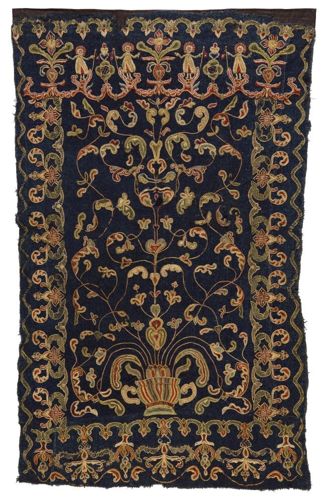 Ábreiða fremur lítil, nær 1,60 m. að lengd og 1 m. að breidd úr bláum einskeptisvefnaði, nokkuð stórgerðum: hún er öll útsaumuð og á henni marglitur blómstursaumur, grænn, rauður, gulur og hvítur og auk þess margvíslegir millilitir eða litbreytingar. Yst meðfram jöðrunum á hliðunum er mjór bekkur, sem liggur í einlægum bugðum, en að ofan eru smábogar og súlnahöfuð í milli og að neðan eru leggir með blöðum: þar fyrir innan er breiður bekkur, mjög stílsettar rósir, og er bekkurinn með sömu gerð á báðum hliðum, en nokkuð frábrugðinn bæði að ofan og neðan, smábogar með súlnahöfðum í milli og rósum upp af: að ofanverðu eru 2 kvenmyndir á hvorum helmingi bekksins með geislabaug um höfuð eða eitthvað þesskyns: þær halda annarri hendi um stengur og blaktir á hverri stöng rauður fáni með hvítum krossi í miðjunni. Neðst á ábreiðunni fyrir innan þennan bekk er stór urtapottur og spretta þar upp úr 10 leggir eða stönglar, er síðan kvíslast um alla ábreiðuna og eru með blöðum og blómstrum: miðblómstrið stendur á 2 leggjum og tekur yfir alla miðju ábreiðunnar upp í gegn og ganga út frá því greinir til beggja hliða: næstu blómstrin tvö ná og alla leið upp í gegn á báðar hliðar. Allur þessi útsaumur er ger af íslenskri ull og með íslenzkum litum, að því er frenst verður séð: bekkirnir og rósirnar eru með gotnesku lagi, mjög stílsettar og þó einfaldar og óbrotnar: kvenmyndirnar á efsta bekknum sýnast eiga að tákna einhverja helga konu t. d. Maríu mey, en fánarnir eiga að sjálfsögðu að tákna þá fána, er hafðir voru í skrúðgöngum klerka í kaþólskri tíð, en ekki hinn alkunna danfána, þótt litirnir séu hinir sömu. Eptir þeim stíl, sem helzt virðist vera að marka í útsaumnum á ábreiðu þessari, mætti ætla, að hún væri frá síðari hluta 15. aldar, en mun þó varla vera svo gömul: aptur á móti sýnist hún að vera miklu eldri en ábreiða nr. 3629, sem líklega er frá fyrri hluta 18. aldar. Ábreiðan er nokkuð slitin sumstaðar, einkum jaðrarnir, og heldur sér þó furðanlega vel. Hún var eitt sinn í eigu Boga Benediktssonar á Staðarfelli og hefir verið í þeirri ætt svo lengi sem rakið verður.