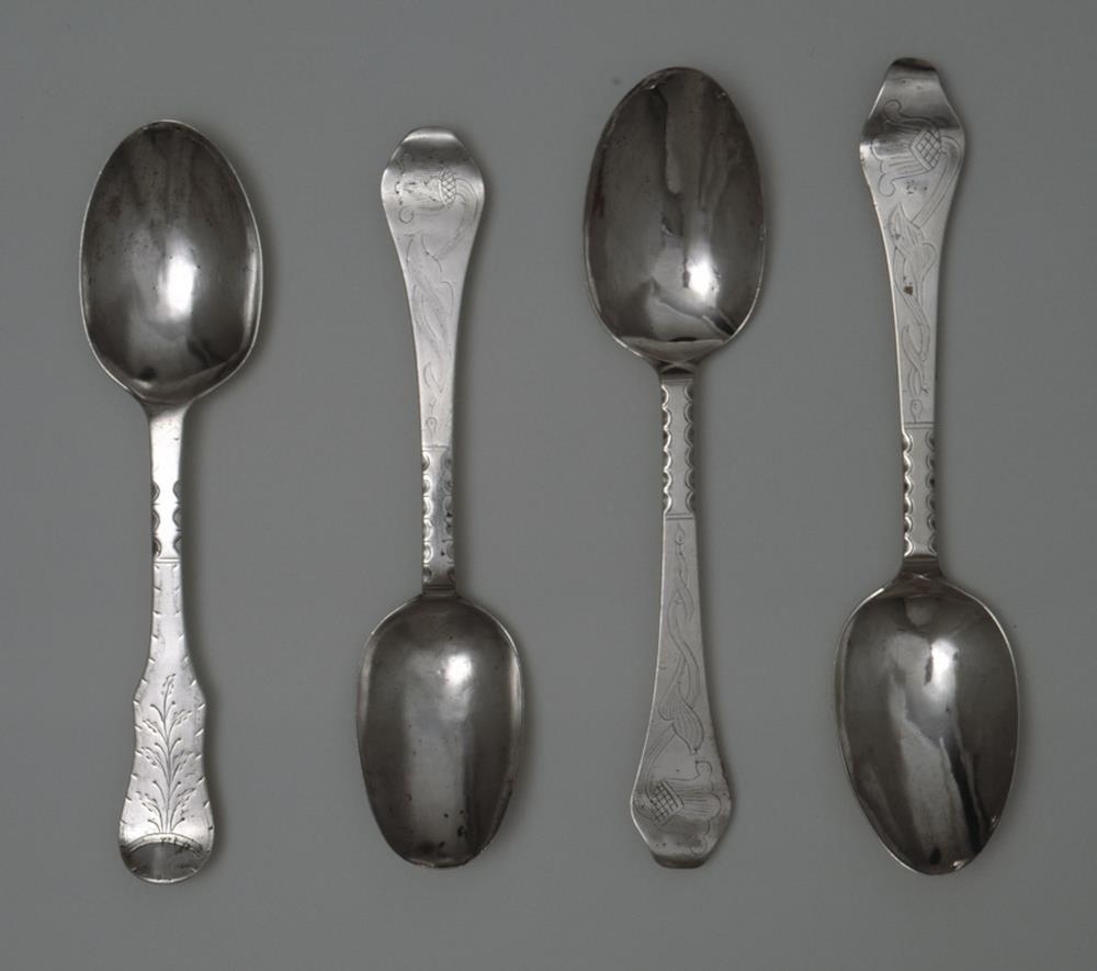Þrjár silfurskeiðar, virðast allar smíðaðar af Halldóri Kláusi Brynjólfssyni silfursmiði á Stóru-Ökrum og Höskuldsstöðum í Skagafirði, d. 1843.