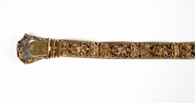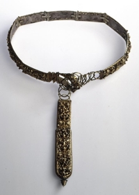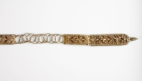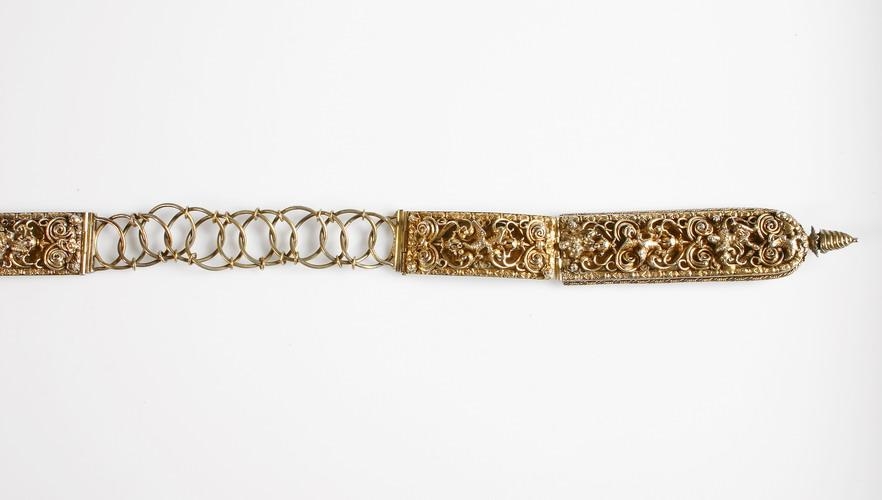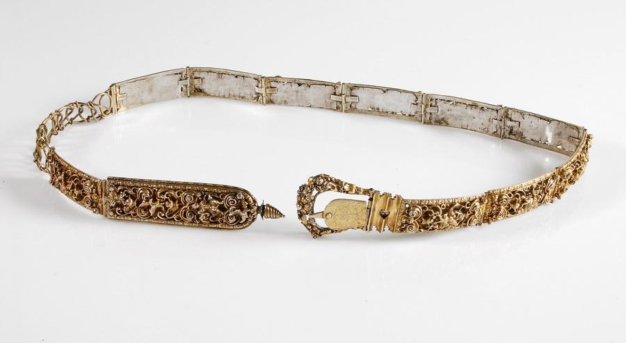 Sprotabelti úr silfri, gyllt á efra borði, sett saman úr níu stokkum sem festir eru saman með þolinmóði. Skrautið er gert mest sem loftverk, klippt og undin silfurplata sem kveikt er innan í grind eða ramma, og ofan á það er kveikt annað skrautverk, sívafðir vírar og blóm. Í miðju er mynd af hauki með þanda vængi og opnar klær. Hringjan leikur á þolinmóð við fremsta stokkinn og á hana kveikt blóm og vírvafningar. Þornið er eins konar silfurskjöldur með litlum broddi fram úr. Við hinn enda beltisins eru samanbrugnir hringar, sem mynda eins konar keðju og hringjan er fest í þegar beltið er borið. Við hana hangir sprotinn, einn stokkur og langur og tungumyndaður sprotaendi með typpi niður úr. Efst á tungunni eru óljósir stimplar. Mun frá 16. öld og erlent. 11427 Sprotabelti úr silfri, gyllt á efra borði, sett saman úr níu stokkum sem festir eru saman með þolinmóði. Skrautið er gert mest sem loftverk, klippt og undin silfurplata sem kveikt er innan í grind eða ramma, og ofan á það er kveikt annað skrautverk, sívafðir vírar og blóm. Í miðju er mynd af hauki með þanda vængi og opnar klær. Hringjan leikur á þolinmóð við fremsta stokkinn og á hana kveikt blóm og vírvafningar. Þornið er eins konar silfurskjöldur með litlum broddi fram úr. Við hinn enda beltisins eru samanbrugnir hringar, sem mynda eins konar keðju og hringjan er fest í þegar beltið er borið. Við hana hangir sprotinn, einn stokkur og langur og tungumyndaður sprotaendi með typpi niður úr. Efst á tungunni eru óljósir stimplar. Mun frá 16. öld og erlent.