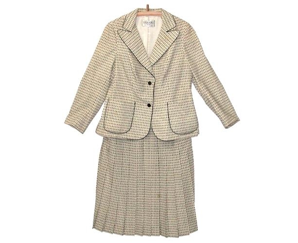jakki með tveimur tölum, úr ljósu ullarefni með áþrykktu símunstri sem