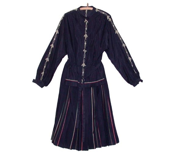 úr dökkbláu gerviefni. Pilsið er plíserað og með hvítum og rauðum röndum.