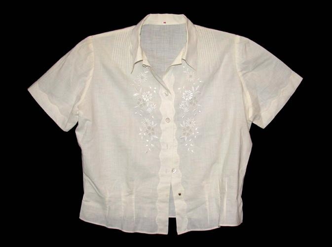 boðungum. Blússan er stutterma og er í stærðinni 46. Nokkrar stuttar saumsprettur