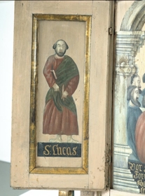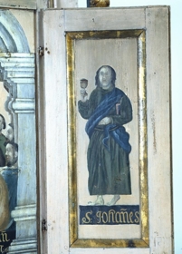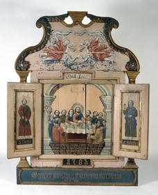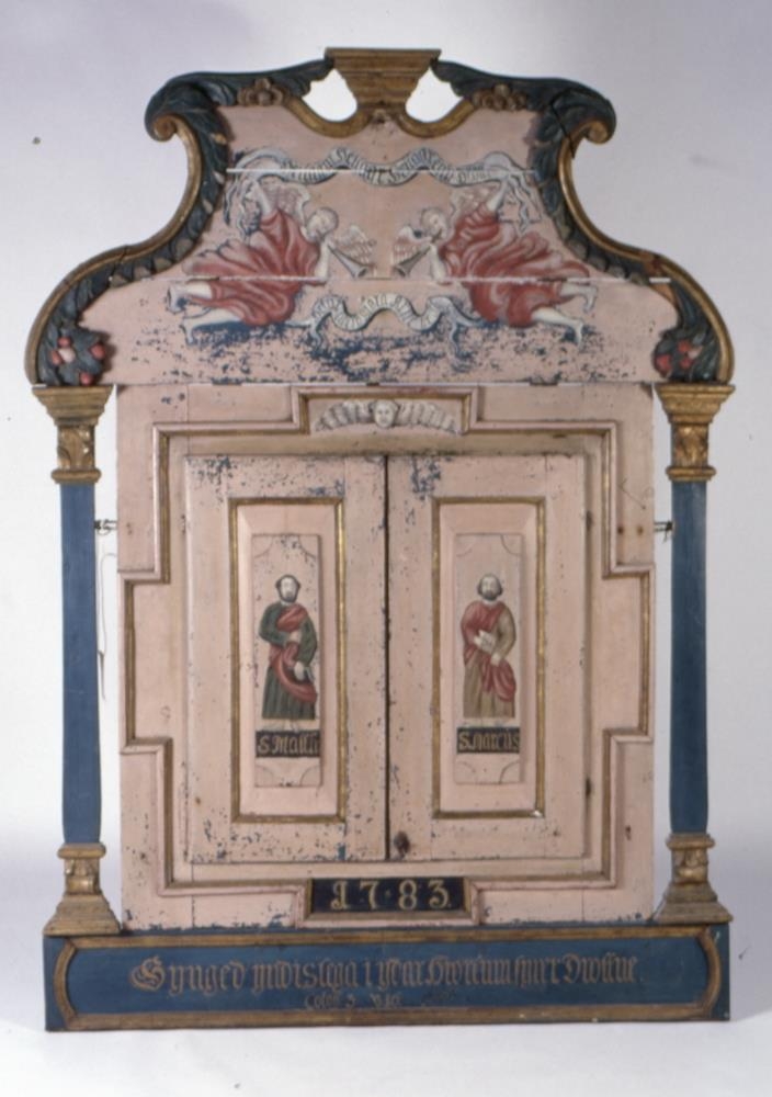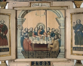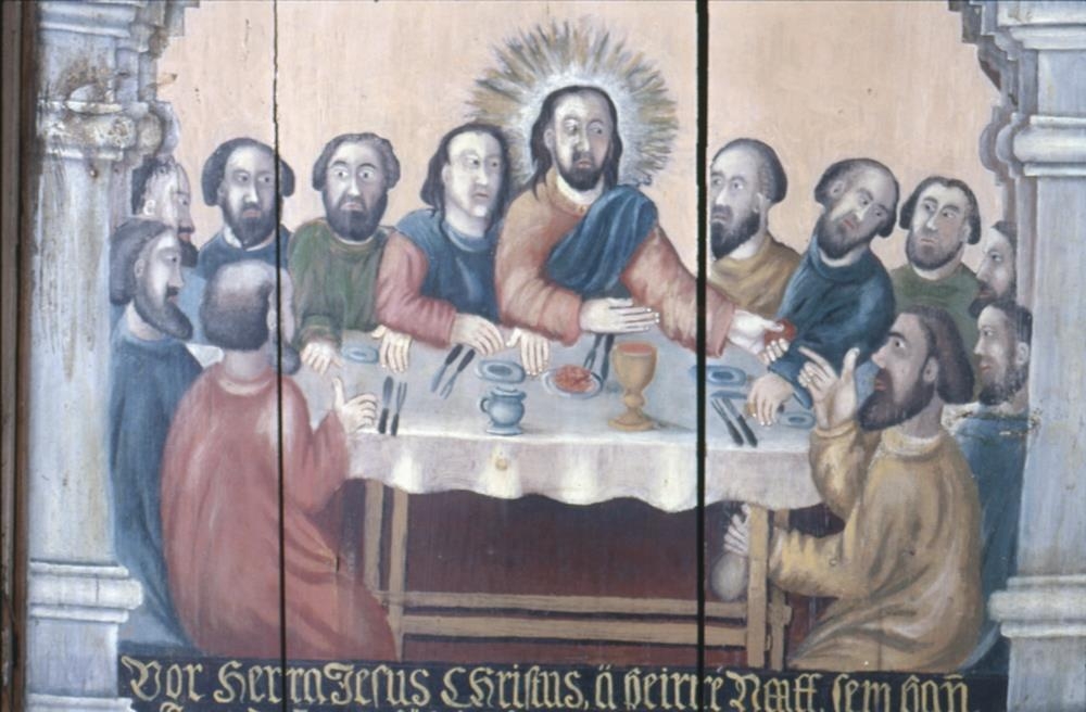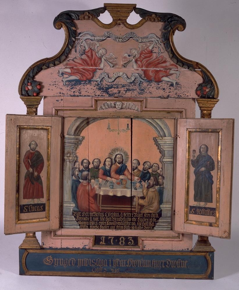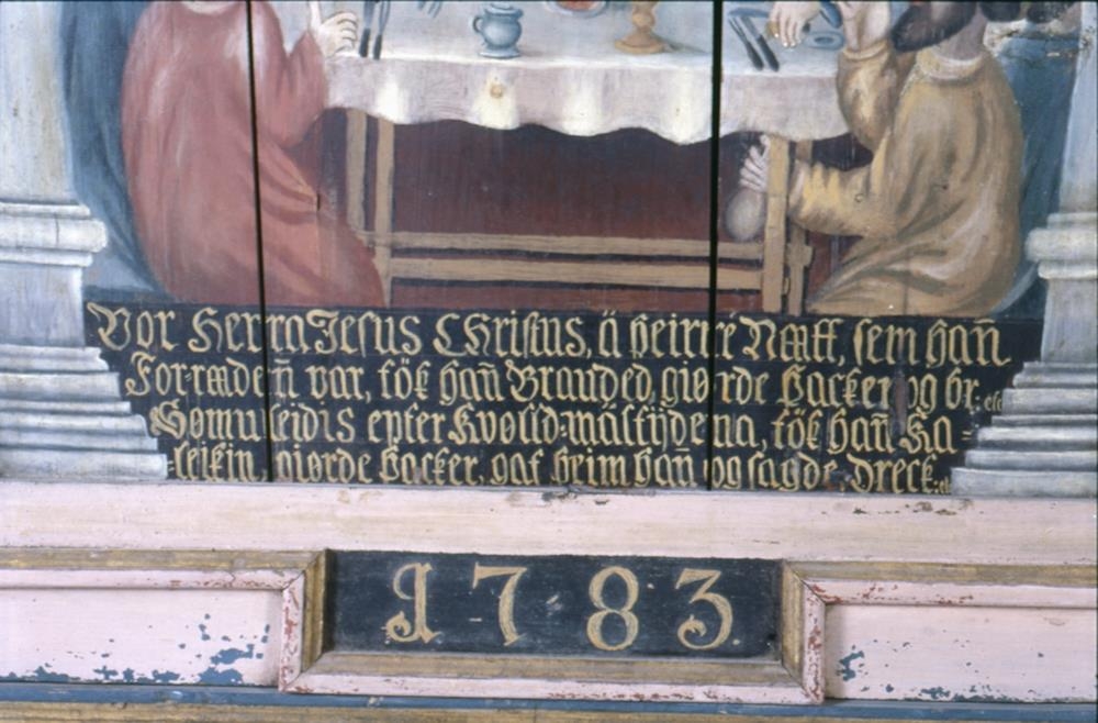 Altaristafla smíðuð úr furu, máluð í fyrstu með bláum lit, en á síðari tímum hefur hún verið máluð með bleikrauðum lit. Taflan skiptist í 3 aðalhluti: Undirtöflu ( predella ), stærð 130 x 19 cm.: á hana er letrað : Syngeð yndislega i yðar HiÝrtum fyrer Drottne. Coloss: 3. v: 16.: miðtöflu, stærð 100,5 x 101,5 cm. og súlur beggja vegna við hana: undirtaflan og súlur þessar eru með sínum upprunalega litum, bláar með gyltum listum og súlnahausum. Á miðtöflunni er máluð kvöldmáltíðarmynd, ártalið, er taflan var gerð, 1783, neðan undir, en engilsmynd uppi yfir. Miðtaflan er með vængjum og eru málaðar á þá myndir guðspjallamannanna. Uppi yfir miðtöflunni er burst , br. 133 cm. og hæð 60,5 cm., mjókkar uppeptir: útskornir listar, blöð og ávextir, fram með brúnunum : á miðja burstina eru málaðir 2 dómadagsenglar og svífa þeir með hvítt band á milli sín, sem á er letrað: Heilagur Heilagr Heilagr ertu Drotten.Fyrir neðan þá er annað band, og stendur á því: Hefur latið giÝra Arne pr. Th: son ( þ.e. sjera Árni Þórarinsson, er síðar var byskup á Hólum ). Uppi yfir burstinni virðist hafa verið lítill kross. Altristafla þessi er vel smíðuð og útskurður góður, en hinar máluðu myndir eru engin listaverk. Hún er án efa gjörð af Ámunda smið Jónssyni ( sbr. nr. 6163 og 6181 ). Sbr. og Odda prestakalls kirkjubók í Þjóðskjalas., bls. 80.