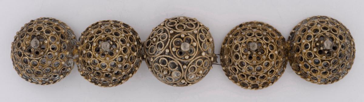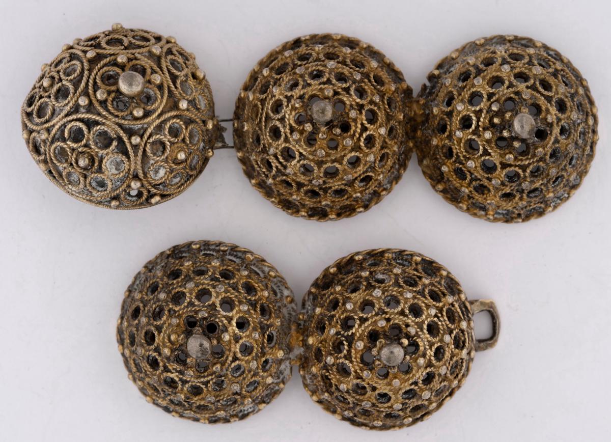 Beltispör, 5 kúptir hnappar, úr gylltu silfri, skreyttir kornsettu víravirki, tengdir í festi.