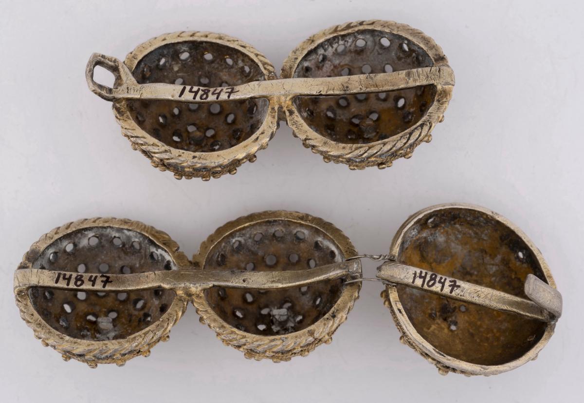 Tveir yztu hnapparnir eru samfastir á mjórri spöng, sem liggur þvert yfir báða. Sá staki í miðjunni er einnig með spöng og auk þess krók út frá henni, sem krækt er í auga á næsta hnappi. Þessi staki hnappur er breiðari en hinir og nokkuð frábrugðinn þeim. Hann er 2.8 sm í þvermál, 1.6 sm á hæð, lítið gagnskorinn. Hinir eru 2.7 sm í þvermál, 1.6-1.7 sm á hæð, mjög gegnskornir.