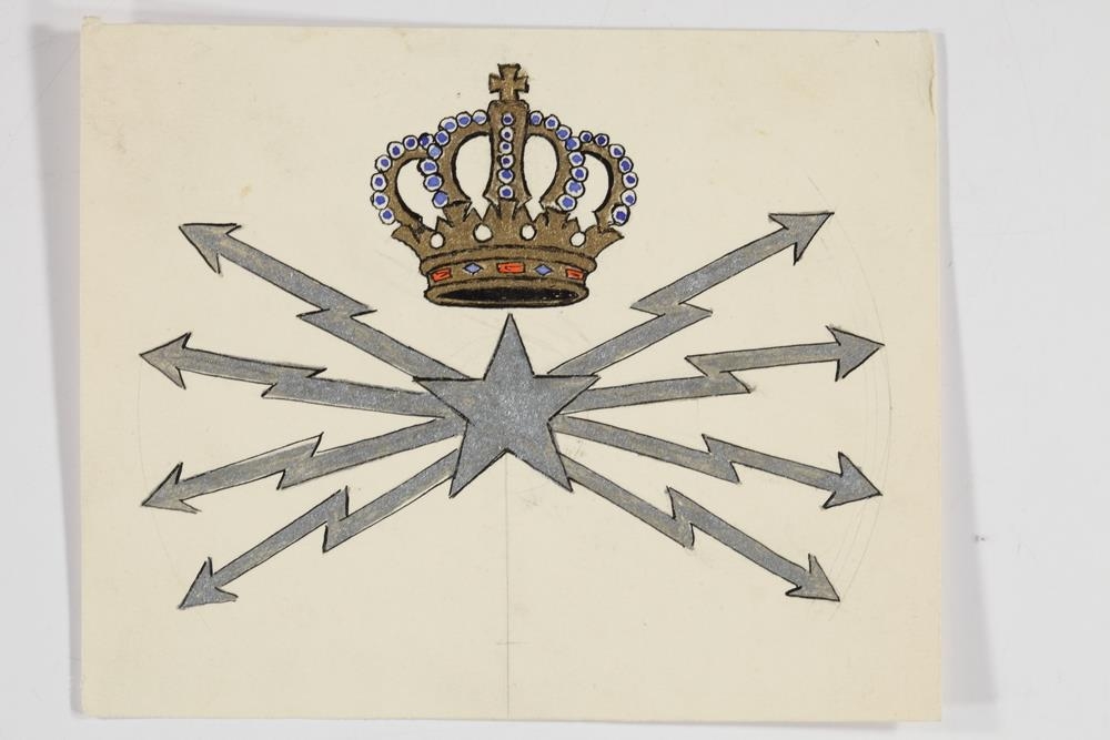 Mynd af einkenni í símafána, stjarna sem frá skýtur eldingum, en kóróna yfir. Þetta gert á hvítan pappa með gull- og silfurbronse og vatnslitum.
