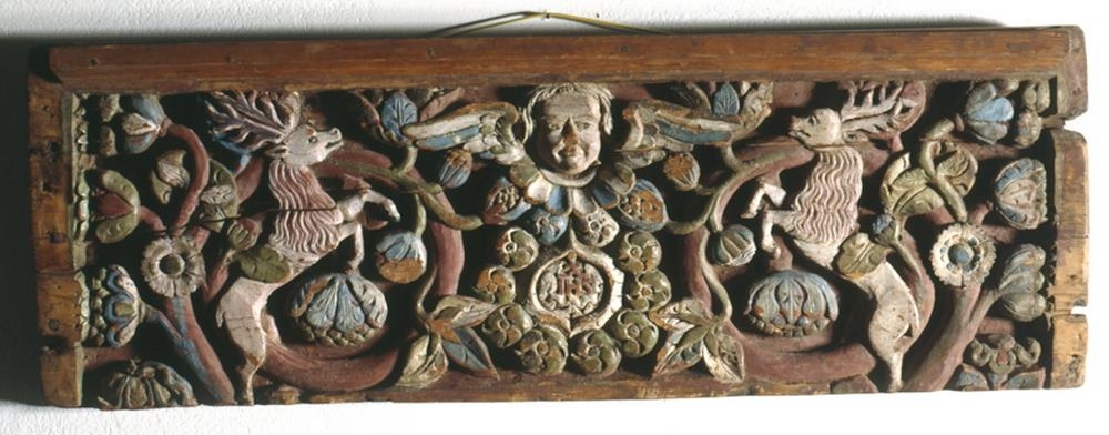 Þverfjöl af efri hluta af framhlið á skáp, öll haglega útskorin með hríngrósum og blómum, til beggja hliða eru hlaupandi hirtir, en í miðjunni að ofan er engils mynd með I.H.S. fyrir neðan, innan í blómhríng.