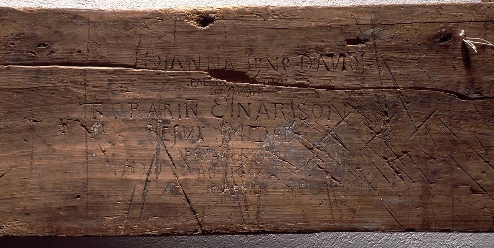 Fjöl af skáp og hurð frá 1699. Á hurðinni sést Jesús ríða inn í Jerúsalem á pálmasunnudag. Skorið af nafnkenndum bónda nyrðra sem kenndur var við galdra ("Galdra-Þórarinn"). :