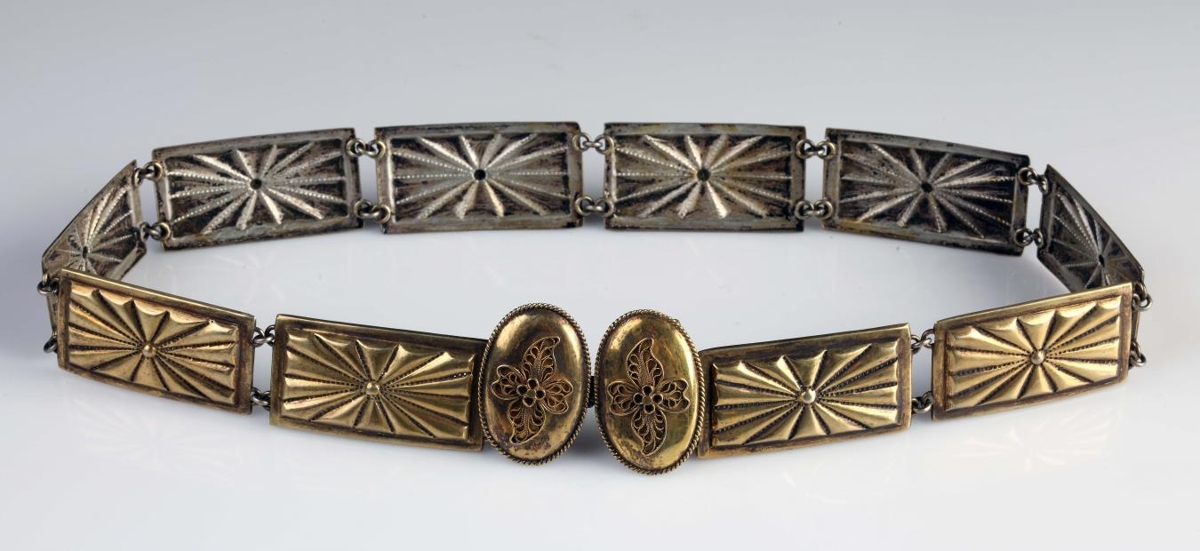 Silfurbelti. Pörin eru sporöskjulöguð með sléttri kúpu að ofan og eiga eiginlega við möttul: ofan á kúpunni er fjögurra blaða rós úr víravirki. Stokkarnir eru 10 og eru festir saman með hlekkjum: þeir eru stampaðir og er bóla lítil eða korn í miðju og ganga gárar upphleyptir þaðan til allra hliða, en lautirnar eru grafnar með gangal. Belti þetta hefir smíðað Benidikt Ásgrímsson um 1870 og kostaði nýtt 37 kr.