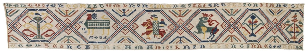 Marglitur rekkjurefill. Hann hefir eigi hríngi, svo sem tíðast er, heldur er honum skipt í fimm sexhyrninga. Í hinum fyrsta sexhyrningi er hrísla, sem dúfa situr uppi á, í öðrum hjörtur, með nafni hjartarins í, í hinum þriðja riddari með bauk, í hinum fjórða kórónaður leon, í hinum fimmta hrísla eða tré, sem tvær dúfur sitja í. Ofan til og neðan til á því er vers þetta með bandaletri: VERTV IFER OG ALLT VM KRING. MED EILIFER (= eilifre) TILSION ÞINNE. SITE GYDS EINGLAR SAMAN I HRING. SÆNGINNE IFER MINN(e). Áður átti tjald þetta Þórdís Árna dóttir prófasts á Kirkjubæ í Hróarstungu, og hafði það áður verið lengi í ætt Bjargar, móður hennar. Það á að hafa verið saumað af nunnum á Skriðuklaustri 1). 1). sögusögn þessi gæti verið sprottin af því, ef á reflinum væri svo kallaður nunnusaumur, annars hefir hún engan stað, því á Skriðu var múnka klaustur en ekki nunnu klaustur (stofnað 1493 - 1500) og versið er úr kvöldsálminum: Ó herra guð, sem húm og dag (prent. í Höfuðgreinabók. á Hólum 1772. II, 478), sem mun vera ortur á seytjándu öld. J:S: