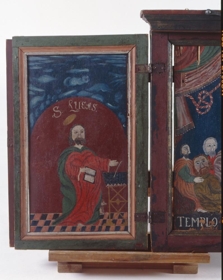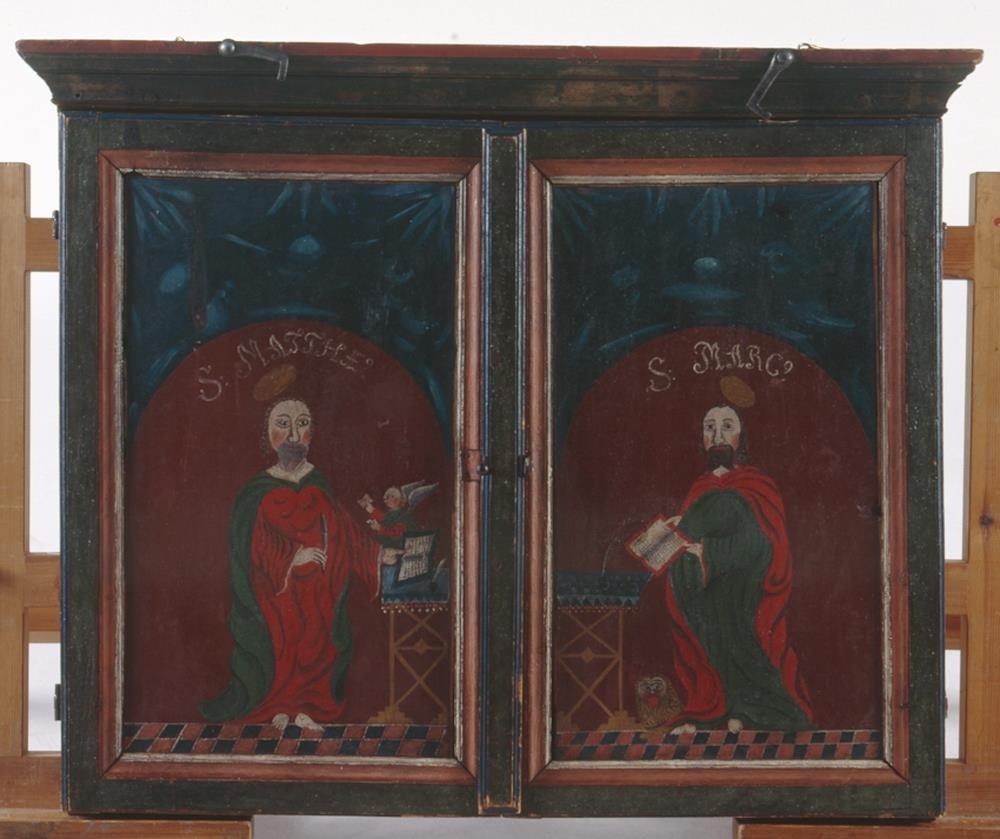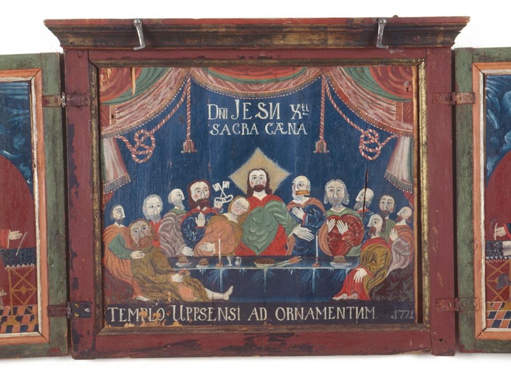 Altaristafla frá Upsakirkju í Svarfaðardal. Tafla þessi er úr tré og er tripthychon þ.e. þrískift með vængjum, hún er (lokuð) 80 sm. á breidd og 70 sm. á hæð með útstandandi bryggju (lista) að ofan. Á aðaltöfluna er máluð kvöldmáltíðin: Jesús í miðjunni með gloriu um höfuðið (gerða í hvasshyrndum ferhyrning og þar af 3 hornin sýnileg) og lærisveinarnir til beggja hliða, Pétur situr við hægri hönd frelsarans, hallast upp að honum og heldur á 2 lyklum í hægri höndinni. Fyrir ofan kvöldmáltíðina stendur DNJ JESU (sie) X ti SACRA CÆNA málað með hvítum stöfum, en fyrir neðan hana: Templo Uppsensi ad Ornamentum 1771. Efst á myndinni eru máluð dyratjöld með snúrum (kvöstum) niður úr. Vængirnir eru á hjörum og er á annan þeirra að innanverðu málaður maður með fjöðurstaf (?!) í hægri hendi og uppfletta bók við hlið sér, glóríu fyrir höfði og þar upp yfir með hvítum stöfum S. Johannes á rauðum grunni, þar upp af er grunnurinn blár (himininn) með ljósleitum rákum (skýjum). Neðst er tígulmyndað gólf með rauðum og bláum reitum. Við fætur guðspjallamannsins stendur örninn. Á vængnum utanverðum er málaður Markús guðspjallamaður með líkum hætti og að innan verðu. Við fætur hans liggur ljónið: fyrir ofan höfuð hans stafirnir: S: MARC? Á hinn vænginn er á sama hátt málaður S: Lucas með nautið að innanverðu, og hinu megin S: Mattheus. Allir hafa guðspjallamennirnir bækur og ritfæri hjá sér, og allir eru þeir eins klæddir, í rauðum, bláum eða grænum kirtlum með rauðar eða grænar skikkjur utan yfir. Altaristafla þessi er illa máluð, sagt er að hana hafi málað Hallgrímur, bróðir séra Gunnars eldra í Laufási. 1) Á lofti.