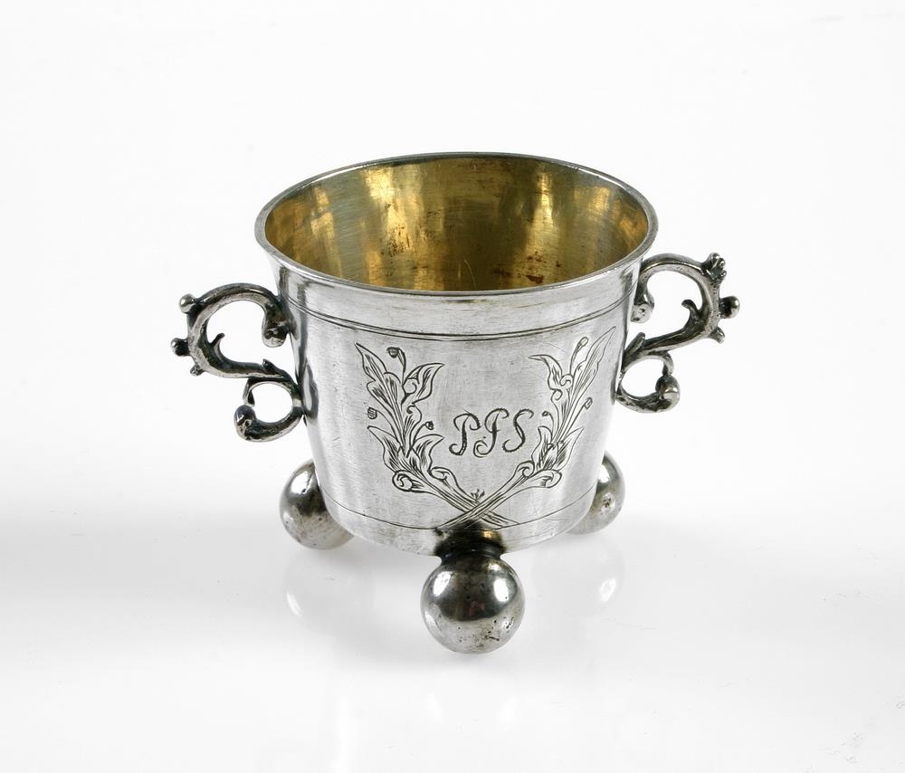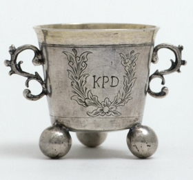Vínstaup, íslenskt, frá 1807, á kúlufótum og með steyptum eyrum beggja vegna. Á askinn eru grafin fangamörk hjóna, PPS og KPD.