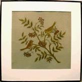 Myndin er saumuð á drapplitan grunn. Hún er í álramma og yfir hana er sett