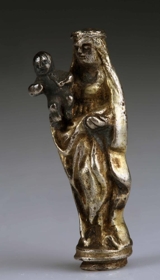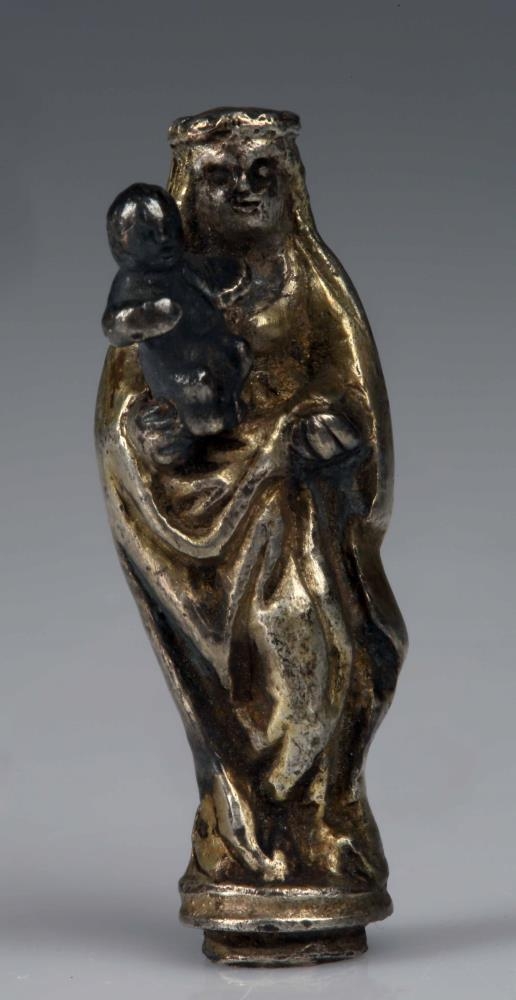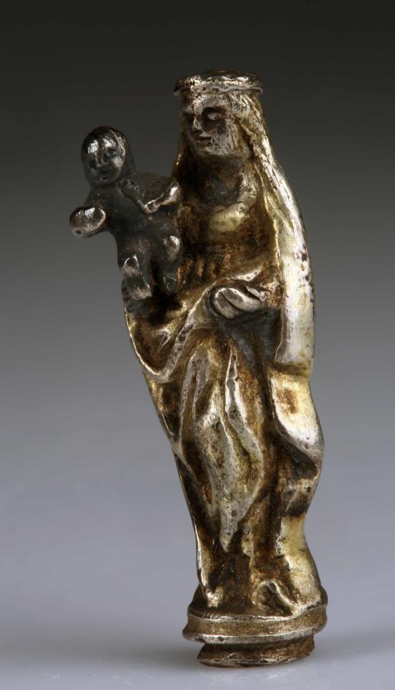 Maríumynd úr silfri gjör, er vegur 1 1/6 lóðs. María er þar í möttli, hefir laust hárið og djásn eða kórónu á höfði. Öll myndin hefir verið gyllt, nema hörundið. Mynd þessi er haglega gjör og ágætur gripur sinnar tegundar. Mér virðist hin lága kóróna og eins búníngurinn benda á, að myndin sé varla ýngri en frá fjórtándu öld. Hún fannst í gömlum öskuhaug fyrir framan bæinn í Stafholti 1848. Þar höfðu áður fundizt leifar af krínglóttri silfurskeið, og hugðu menn, að þar hefði á verið leifar af krossmarki, og að það hefði verið upprunalega á miðju skaptinu, en þessi Maríumynd hefði verið aptan á skaptinu fyrir knapp*. * gripunum, sem hér eru taldir nr. 64-74, er lýst í skýrslu í Þjóðólfi XVI, nr. 17-18, bls 70-71.