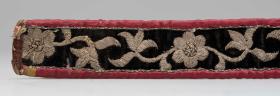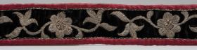 úr svörtu flujeli, bryddur með rauðu atlasksilki og fóðraðar með rósþryktu