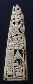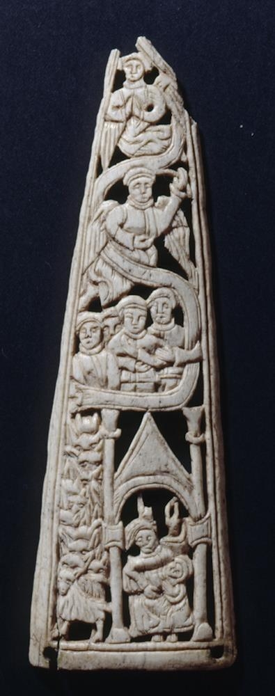 Úr myndatexta: „Útskorið hvalbein, ..., með útskornum og gagnskornum myndum er sýna fæðingu Krists. Efst eru tveir englar í klæðnaði frá endurreisnartímanum, á miðju fjórir menn, trúlega fjárhirðar, neðst hjörð þeirra vinstra megin og María með Jesúm í fanginu hægra megin en jatan, uxinn og asninn þar til hliðar. Umhverfis Maríu og jötuna eru súlur og burst yfir.“