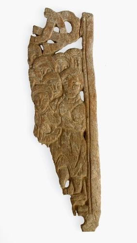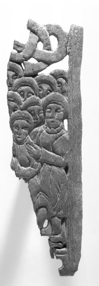 Partur af beinspjaldi, er fannst undir bænum á Klausturhólum, er hann fyrir fám árum var reistur á ný. Það er með gagnskornum knút að ofan og mannþyrpíng neðan undir . Á einum manninum sést votta fyrir pípukraga, er hann hefir um hálsinn, sem sýnir, að spjaldið varla muni vera eldra en seint úr pápiskri öld, eða seint frá fimtándu öld. Hér hefir verið myndað eitthvað úr biblíunni, óvíst hvað.