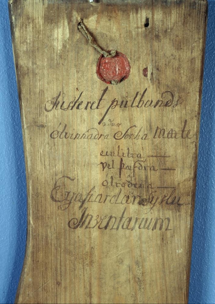 „Aftan á hylkinu og eins aftan á sokkatrénu sjálfu eru áletranir sem ekki voru færðar til bókar við skráningu. Í hylkið efst eru tvívegis skornir stafirnir I Í S, þar fyrir neðan er skrifað með svörtu bleki: „PWLBANDS maaten A[n?] 1770 og 1778 VaadlaSys[--?],“ en á sokkatrénu má lesa: