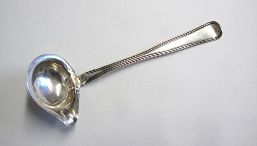 Sósuskeið, lítil úr silfri, eftir Hallgrím Kristjánsson gullsmið á Akureyri (f. 1818, d. 1884), og tvístimpluð með stimpli hans, HK, á bakhlið skaftsins. Að öðru leiti ógrafin og -stimpluð. Skaftið er skreytt að framanverðu með tveimur strikum meðfram brúnum og 1,5 cm frá mótum skafts og blaðs gengur lítið hak út úr skaftinu beggja vegna til skrauts. Skeiðin var rifin á mótum skeiðar og blaðs en í nóvember 2009 tók Ívar Björnsson, gullsmiður og leturgrafari í Reykjavík, hana til viðgerðar og kveikti saman. Skeiðin er því í góðu ástandi en sjá má að hún hefur allmikið verið notuð.