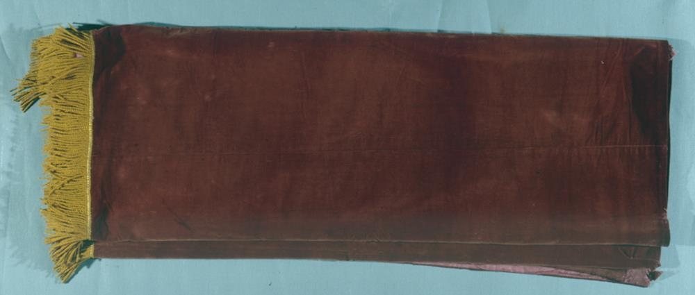 Altarisklæði úr rauðu flaueli, fóðrað með ljósfjólubláu lérefti, faldað neðan með gulu kögri, 90 x 272 cm að stærð, ætlað til að ná um altarið á 3 vegu, sbr. 13100. - Úr Hrunakirkju.