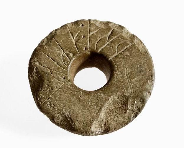 Snældusnúður úr móleitum steini mjúkum, kúptur ofan og flatur neðan, þver. 5,4 cm., þ. 1,4 cm. Kringlótt gat í miðju, 1,4 cm. að vídd efst, en 1,7 að vídd neðst. Hefur verið sljettur og vel jafn, en kvarnast hefur nokkuð úr brúnunum. Neðaná er krotað með rúnum: (þ.e. Þóra á mig) og þar fyrir aptan, óljóst og líklega af öðrum síðar \O, sennilega * og ¦. Gefandinn skrifar m.a. um þennan hlut: Vera má að hér sé bundið nafn þess, er snúðinn gjörði, eða gaf Þóru. Snúðurinn fanst haustið 1880 í maturtagarði fyrir neðan bæinn í Hruna, ofarlega í mold. Garður þessi hefur verið yrktur víst 60 ár, og hafa aldrei fyr í honum fundist fornmenjar neinar, svo menn viti. Ef til vill hefur hér verið ösku - eða sorp-haugur til forna, þótt ekki hafi þess sest nein merki. Einhvern tíma hefði þótt ekki ósennilegt, að snúð þenna hefði átt Þóra Guðmundsdóttir, kona Þorvalds Gissurarsonar og móðir Gissurar jarls. Þóra var í Hruna frá því hún giptist Þorvaldi 1197 og síðan fullan aldarþriðjung, en rithátturinn \¦/ ¦ ¦°/ fyrir \¦/ ¦ ¦°/ (mik) er víst yngri en svo að áletrunin geti verið frá þessu tímabili: varla eldri en frá 14. öld.