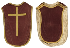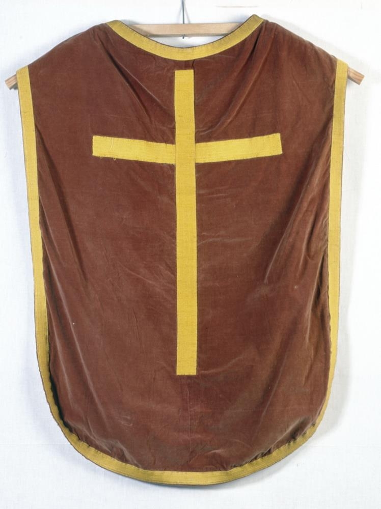 Hökull úr rauðu flaueli, fóðraður með hvítri lastingu, krækt með 3 krókapörum á vinstri öxl, bakhlutinn 93 cm síður, 70 cm breiður, brjósthlutinn 79 cm síður og 50 cm breiður. Á bakhlutann er saumaður kross, ofinn úr gulu ullarsilki 4 cm breiður. Stofn hans er 66 cm að hæð, þvertréð 39 cm langt. Allir jaðrar eru lagðir sams konar borðum, 2,5 cm breiðum. Nýlegur. - Úr Hrunakirkju.