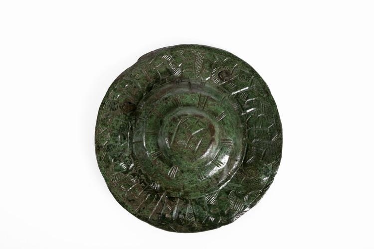 með fjórum koparnöglum, og er líkt og eyra eða fótur í aðra röndina á plötunni,