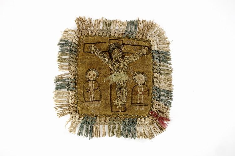 gulur að lit. Hann er með krossmarki, saumuðu með gylltum vír, og standa