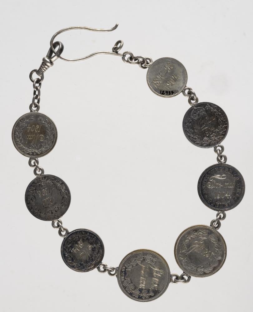 Úrfesti af samanhlekkjuðum minnispeningum, 8 talsins, 1 hollenzkur, 2 enskir, 2 sænskir, 1 svissneskur, 1 þýzkur, 1 danskur. Þeir eru allir úr silfri með ágröfnum mánaðarnafni og ártali, til minningar um utanfarir Guðmundar Magnússonar (Jóns Trausta, f. 1873, d. 1918), skálds og prentara. Fimm peninganna eru frá 1904 (á einn þeirra er grafið:1896-98; á annan: Febr.-maí; á einn: Maí-júní; á tvo: Maí). Á einn peninginn er grafið: Júlí 1896; á annan: Júlí 1897; og á einn: Júlí 1896, júní 1898.