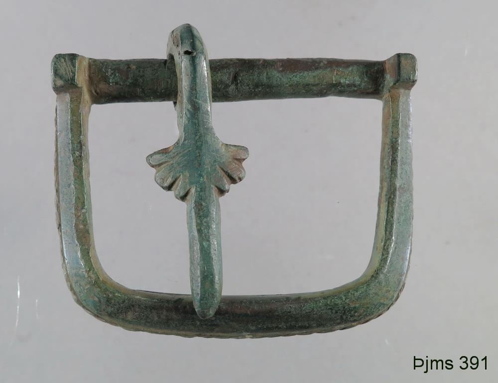 Forn gjarðarhríngja úr kopar, stór, 3 þumlúngar þvert yfir, með snúníng allt í kríng að framan og á hliðunum, og liljulöguðu þorni, og tveim ferstrendum typpum uppúr að ofanverðu. Hún er of ferhyrnd til þess að geta kallazt hófhríngja, þó hefir hún helzt það lag, og er hún að því lík hinni fornu járnhríngju úr Hafurbjarnarstaða-fundinum, sjá nr. 566 hér á eptir. Nær því alveg eins hríngja er til í safninu í Kaupmannahöfn: Worsaa'es nordiske Oldsager 1859, nr. 485. Þær eru báðar eflaust mjög gamlar og varla ýngri en frá 12. til 13. öld. Hún fannst á víðavangi fyrir innan Kollabæ í Fljótshlíð.