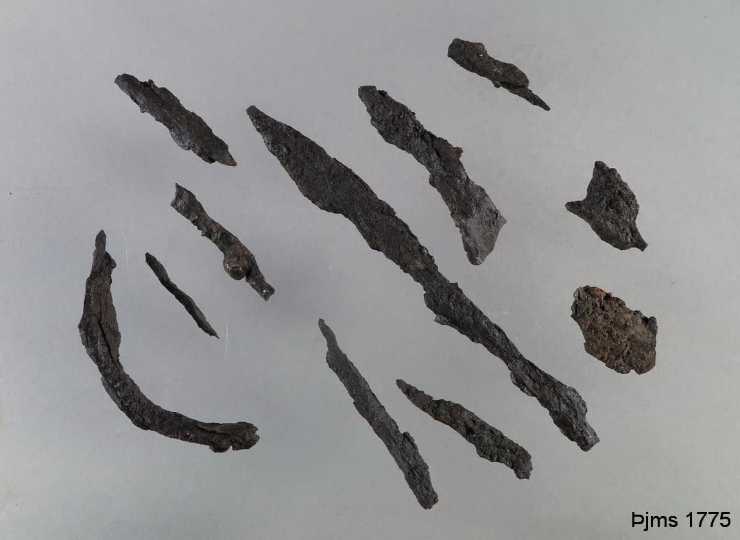 Skærabrot allmörg úr járni; verða nú ekki sett saman, en samkv. eldri lýsingu í Árb. 1880-81, bls. 57, hafa brotin fyrst verið 6 og skærin virzt vera nær 26 cm. að lengd. Þau hafa verið með því lagi sem nú tíðkast á sauðaklippum og voru slík skæri algengust á víkingaöldinni og hafa opt fundist í dysjum frá þeim tíma í Noregi, bæði karlmanna- og kvenna-dysjum. - Brotin vega nú alls 100 gr.