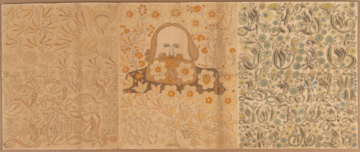 Uppdrættir eptir Sölva Helgason, 3, settir saman í eina umgjörð, st. 46 x 105 cm. að utanmáli, en breidd listans, sem hún er úr, er 2,5 cm. Hver uppdráttur fyllir heila pappírsörk og er gerður með ýmsum skrautlegum litum. Á hinum fremsta eru upphafsstafir hjóna og er mikið blómskraut um þá,: á þeim, sem er í miðju er mannsmynd og stafirnir S. og H. hjá á tveim stöðum, en allt í kringum myndina og þá er mikið blómskraut: sennilega tákna stafirnir S H, að myndin eigi að sýna Sölva Helgason sjálfan. Á aptasta uppdrættinum er stafrofið, mjög skrautlegir upphafsstafir. Allt er gert með töluverðri leikni og vandvirkni, en smekklaust og barnalega þó, eins og allt þess háttar eptir þennan mann.