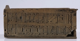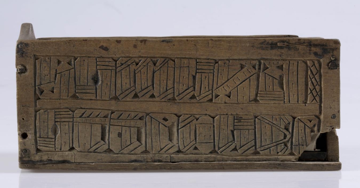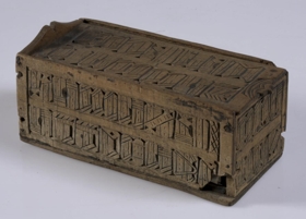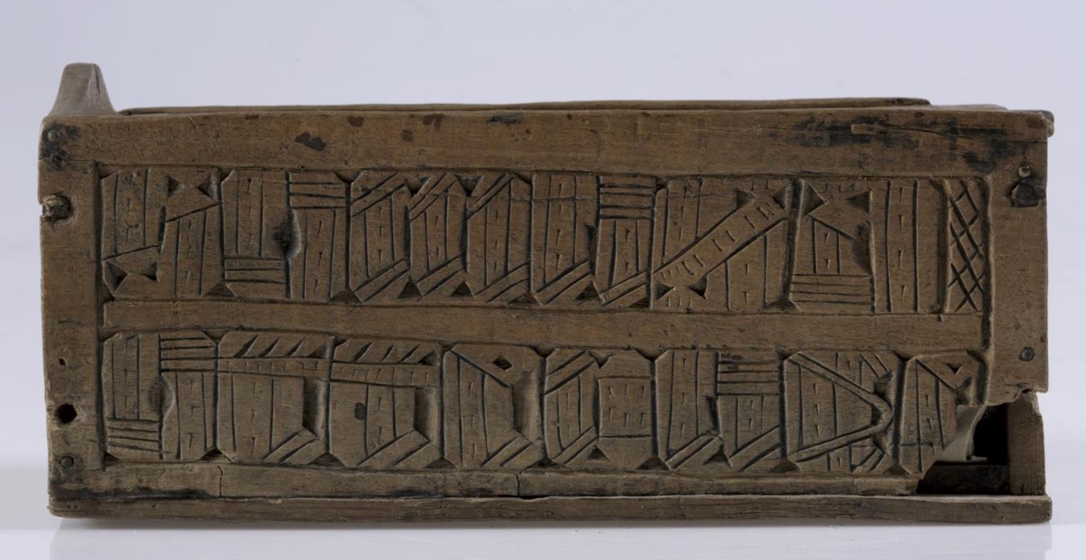 úr bæki og eik (botninn), l. 19,3, br. 9, g. 7,9 cm. Draglok á. Negldur
