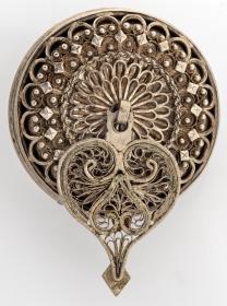 er hjartamyndað og fylt með lykkjum af víravirki: ofan á því eru 2 kringlóttar