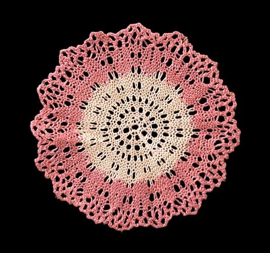 bleikur utanmeð, hvítur hringur í miðju. 15 cm í þvermál. Kom ásamt öðrum