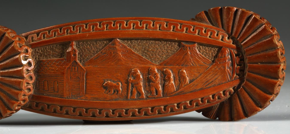 á sömu hlið er skorin upphleypt mynd af kirkju, fjallshlíð og tveimur fjallshnúkum,
