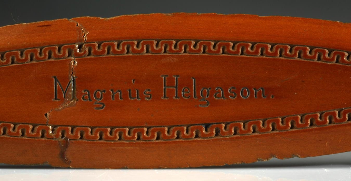 á er skorin áletrunin: "Magnús Helgason"; og á skaftið