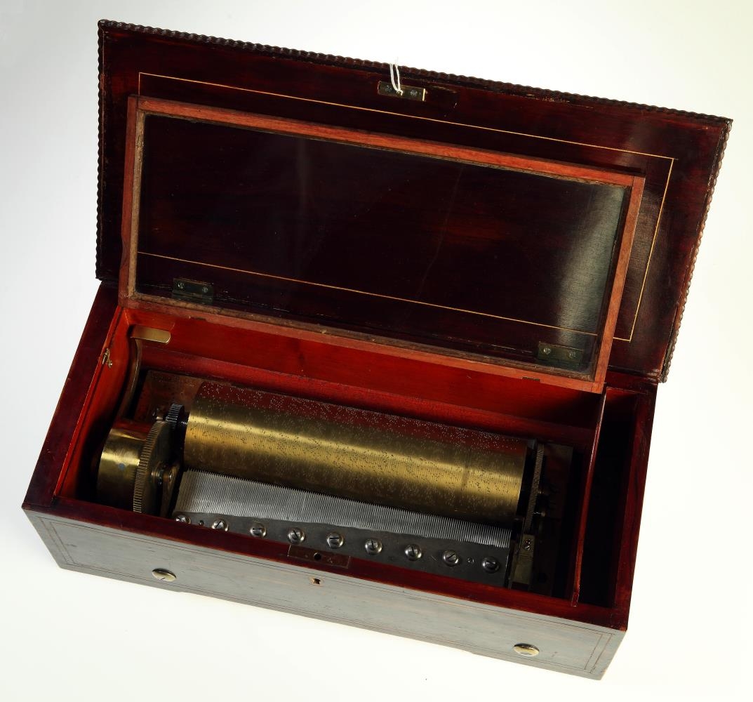 Lengd 48,4, breidd 21,7, hæð 14,7 cm, fyrir neðan lokið, það er að þykkt 1,1 og 49,8 x 23,5 cm. Botninn er úr greni. Verkið er úr kopar og stáli, fest í með skrúfum, sem ganga inn í gegnum hliðarnar, 2 í hvorri. Kamburinn með tónfjöðrunum er úr stáli, 28,5 cm að lengd og eru fjaðrirnar um 160 að tölu; hafa sumar sama tón, 2-4 saman. Sívalningurinn, sem snýst fyrir framan þær, er með ótal smánöglum, sem snerta þær; hann er úr kopar, jafnlangur kambinum og 8,3 að þvermáli. Hann snýst með einskonar hjólverki, og er það knúið áfram af fjöður í stóru fjaðurhúsi við vinstri enda, en stilling og hraði temprast með hjólverki við hægri enda. Undir eru járn, sem eru færð til vinstra megin, felast endarnir þar milli gaflanna og má taka hinn ytri frá.
