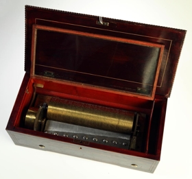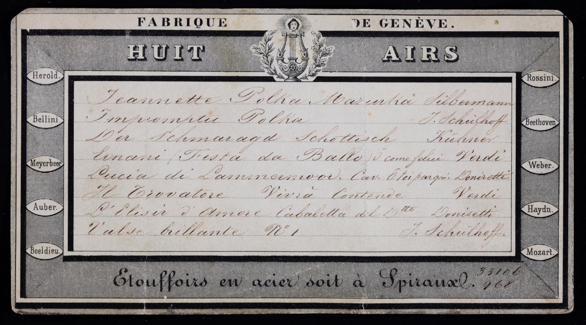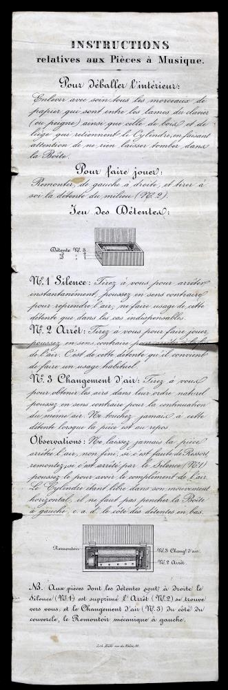 Spiladósinni, kassanum, er læst með skrá og lykli. Hún er algerlega óskemmd og spilar lögin vel. Hún er með stimpluðum nöfnunum Du-commun-Gibod og tölumerkinu 33106 fyrir ofan. Sama tölumerki er skrifað á söngskrána og 968 neðan undir þar. "Fabrique de Genève" stendur efst á söngskránni. Sjálfsagt gerð þar um miðja öldina.
