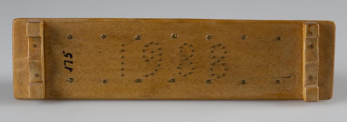 Stokkur, skrínulagaður, úr birki, smíðaður af gefanda. Lokið er laust, ofurlítið kúpt, botninn negldur á með látúnsstiftum; stendur á 2 fótum, neðan á hann er punktað með látúnsstiftum ártalið 1938. Botninn er 18 cm að lengd, 4,5 cm að breidd, hliðin er 16,5 cm að lengd við botninn, en ekki nema 12 cm efst, gaflinn 3 cm; lokið er 13 cm að lengd, 3,3 að breidd, hæð undir lok 4,1, með loki 5 cm.