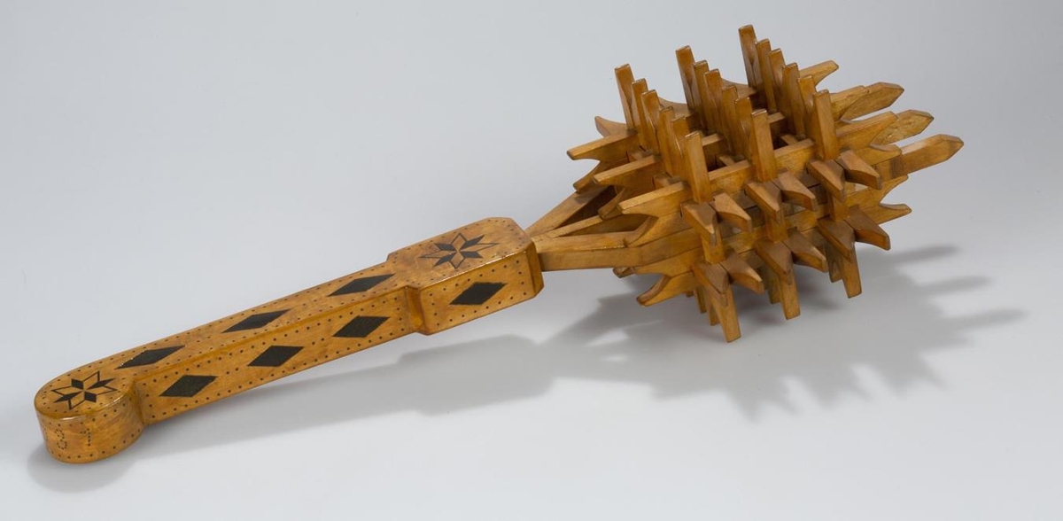 Högnakylfa, smíðuð af gefanda, úr beyki, lökkuð gul að lit. Grindin, sem lausu stykkin eru felld utan á, er eins og þríálmaforkur í laginu, límd saman að neðan og greypt niður í skaftið. Er hún um 28,5 cm að hæð upp frá skaftinu, breidd 9 cm. Lausu stykkin, sem saman eru felld, eru 36 að tölu, lengd þeirra er 9,2 cm, breidd 1,4 - eða tvö saman 2,8 cm. Skaftið er 33 cm að lengd, eru á því hnúðar fremst og aftast, sá fremri er næstum því ferhyrndur en þó nokkuð aðskorinn bæði framan og aftan, lengd haus er 9 cm, breidd 6,2 cm; sá eftri er bogadreginn og gengur í eitt með hlið skaftsins öðru megin, en myndar hálfhring hinu megin, þvermál hans er 5,6 cm, breidd skaftsins er 4,1, þykkt 3,3 cm. Á báðum breiðari hliðum skaftsins eru tvær 8 odda stjörnur sín á hvorum hnúð, eru 4 blöð hverrar stjörnu og umgerðir um þær úr hvalskíði, sem greypt er inn í tréð. Á milli stjarnanna eru greyptir á hvorri hlið 3 tíglar úr hvalskíði. Í mjórri hliðarnar eru greyptir tiglar úr hvalskíði, 4 öðru megin, en 5 hinu megin. Meðfram öllum köntum og í miðlínu allra hliðanna (á milli tíglanna) eru felldar inn mjög smáar doppur úr hvalskíði, og á endanum er ártalið 1937 myndað úr samskonar doppum.