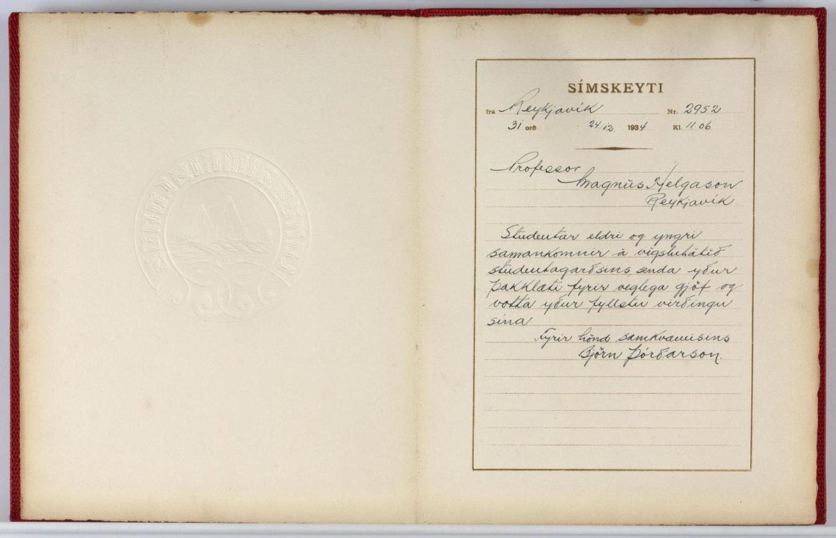 Skrautskeyti í rauðum spjöldum, framan á er þrýst og að nokkru gyllt mynd af sveitabæ og í skeifu í kring með höfðaletri: "Landssími Íslands." 29,5 x 23 cm að stærð. Inniheldur heillaskeyti með þökkum fyrir gjöf á vígsludegi Háskólans, 24/12 1934, frá stúdentum eldri og yngri.